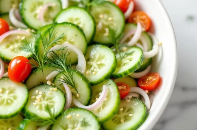 - Use a spoon or tongs to toss the cucumbers gently, hearing the slices slap softly against each other as they absorb the dressing.