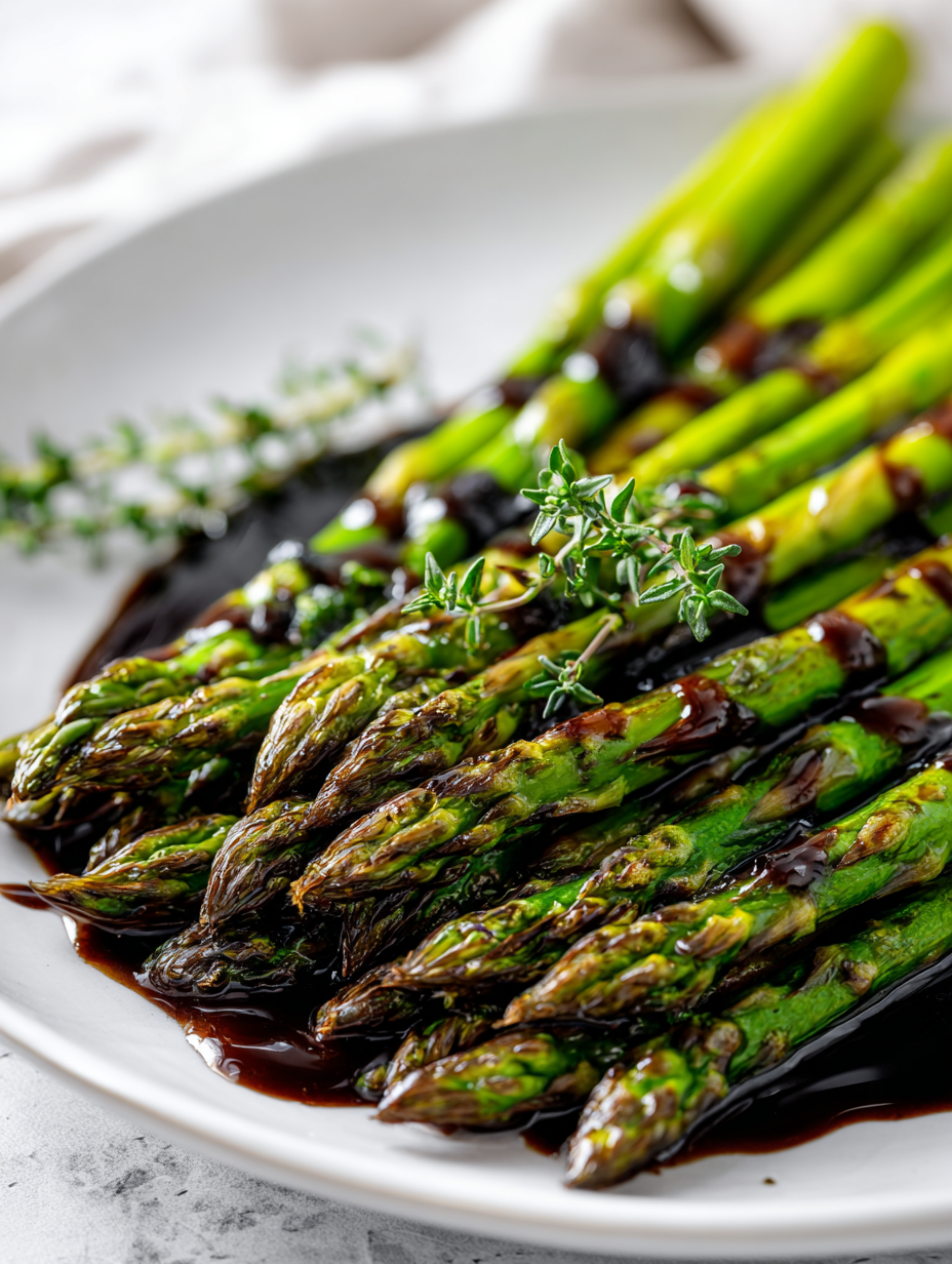 Focusing on the unexpected delight of transforming simple roasted asparagus into a glossy, slightly smoky treat with a drizzle of aged balsamic, elevating a humble vegetable into a sophisticated side.