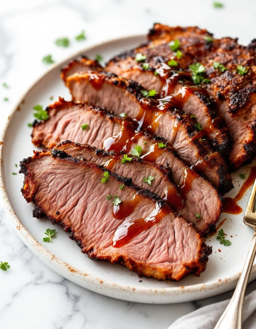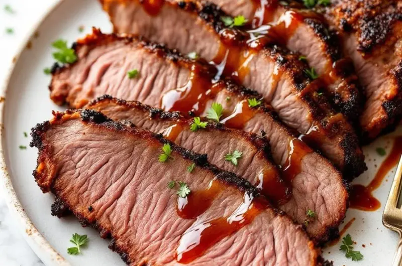 Reheat slices gently in a covered dish in the oven at 250°F. The meat should steam slightly, releasing a warm, smoky scent and staying moist to the touch.