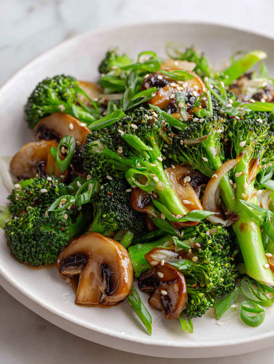 Stir the broccoli around with your spatula or tongs, then add the sliced mushrooms. Cook for another 3-4 minutes, stirring occasionally, until the mushrooms release their earthy aroma and edges turn golden, shrinking slightly.