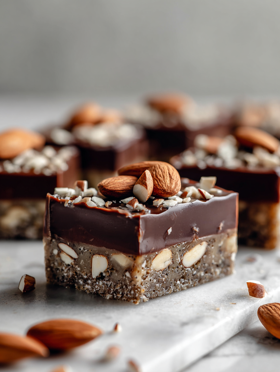 Pour the melted chocolate over the chilled base, spreading evenly with a spatula. Optionally, sprinkle a pinch of sea salt or chopped almonds on top.