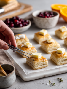 Assembly is straightforward: place a small piece of Brie in the center of each pastry square, then spoon a few cranberries over the cheese. To make it easier, you can fold the edges of the pastry slightly over the filling or leave them open, depending on your preference. For a final touch, lightly brush the edges with beaten egg to help them turn golden and shiny as they bake.