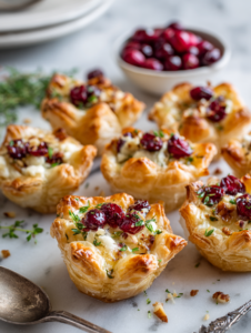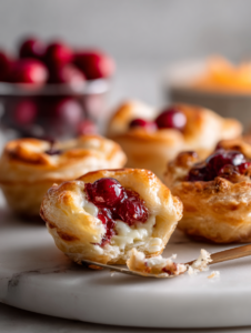 Bake the bites in a preheated oven at 375°F (190°C) for about 15-20 minutes, or until the pastry is puffed and golden brown. The cheese should be melted and bubbly, and the cranberries softened and fragrant. Serve these warm for the best experience, though they can also be enjoyed at room temperature.